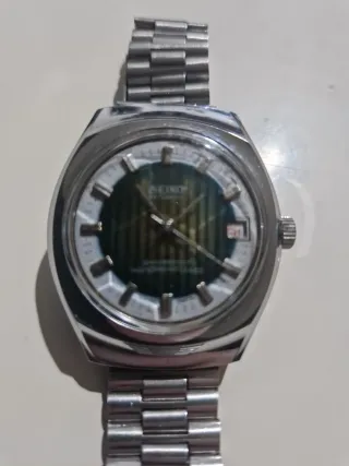 Vendo reloj Seiko automático vintage, original, de estética clásica y muy buscada. Características: Marca: Seiko Movimiento: Automático Funciones: Hora + día / fecha Caja: Acero inoxidable, diseño tipo cushion (tonel), muy representativo de los años 70 Esfera: Verde con efecto rayos verticales, cambia de tono según la luz Índices: Aplicados Cristal: Acrílico (normal en relojes vintage) Brazalete: Metálico de época Diámetro aprox.: ~37 mm sin corona Estado: Funciona correctamente Desgaste acorde a la edad (ver fotos) No restaurado en exceso, conserva su encanto original vintage 📌 Ideal para coleccionistas o para uso diario con estil