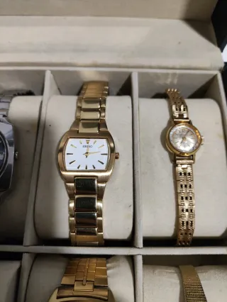 🛠️ Lote de Relojes y Correas Seiko Lady | Automáticos (salvo uno de cuarzo) | Para Reparar o Piezas Se vende lote completo de relojes Seiko Lady y correas, ideal para relojeros, coleccionistas o repuestos. El conjunto incluye varios modelos automáticos y uno de cuarzo, en diferentes estados. Perfecto para restauración, proyectos o aprovechar piezas originales Seiko. Incluye: • Relojes Seiko Lady automáticos (varios modelos y esferas distintas) pequeño tamaño • 1 reloj Seiko Lady de cuarzo • Múltiples correas metálicas originales Seiko (acero y doradas) • Cajas, biseles y partes varias Estado: 🔧 Para reparar o usar para piezas