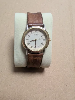 Reloj Seiko Quartz Slim de estilo clásico y elegante. Caja dorada ultrafina con esfera champagne y numerales romanos, diseño atemporal ideal para vestir. Funciona perfectamente. Cristal abombado que le da un perfil más elegante y vintage. Correa de piel marrón aftermarket en muy buen estado (no original). Reloj fino, ligero y muy cómodo en muñeca. Ideal para uso diario o eventos formales. 📦 Se vende tal cual se ve en las fotos. 📩 Cualquier duda, pregunta sin compromiso.