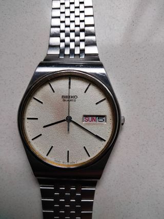 Reloj JDM (lo que significa que fue diseñado específicamente para el mercado japonés) -Marca®️: Seiko 🇯🇵 -Referencia: 0903-8120 -Nº de serie: 655737 -Estado✅: en un fabuloso estado de conservación (señales de uso acorde a su edad, pero bien cuidado) y funcionado correctamente (pila recién cambiada). -Tamaño aprox.📏: 35,6mm sin contar la corona. -Color esfera🕢: blanco con manecillas, fechador y marcadores en tono plateado. -Movimiento: Quartz. -Fechador: inglés/Kanji. -Año de fabricación aprox.📆: 1976. -Material correa🎗️: acero de la época del reloj, de la marca Maruman (prestigiosa marca, especializada en hacer correas para relojes)