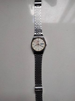 ¡Vendo precioso y elegante reloj Seiko SQ chapado en oro al completo, siendo un reloj Unisex! -Marca®️: Seiko 🇯🇵 -Referencia: 5Y23-1001 A4 -Nº de serie: 060063 -Estado✅: en un estado fabuloso de conservación (cristal impecable) y funcionando perfectamente (pila recién cambiada). -Tamaño aprox.📏: 31,5mm sin contar la corona. -Color esfera🕢: texturizada en color negro con manecillas y marcadores en tono dorado. -Movimiento: Quartz. -Fechador: inglés. -Año de fabricación aprox.📆: 1990. -Material correa🎗️: acero original de Seiko en tono dorado (sólo una leve pérdida de color en un eslabón), para contorno máximo de muñeca hasta 18cm.