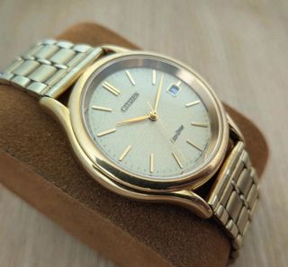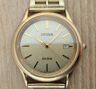 Elegante Citizen original con tecnología Eco-Drive (se carga con luz solar o artificial, nunca necesita pilas). Un reloj fiable, sostenible y con estética clásica. • Tecnología: Carga solar infinita (Eco-Drive). • Diseño: Esfera texturizada tono champán con calendario a las 3. • Resistencia: Water Resistant 5 Bar y Antimagnético. • Estado: Funcionando perfectamente. Presenta desgaste natural del dorado por el uso, lo que le da un aire vintage auténtico. Tapa trasera con grabado japonés original.