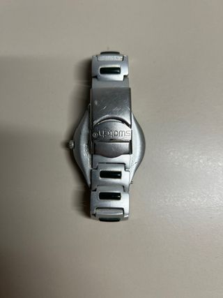 Reloj Swatch Irony de aluminio. Suizo, totalmente funcional. Correa metálica por eslabones, en buen estado, con ligera decoloración amarillenta entre los eslabones por uso, típica del desgaste normal. Cristal y caja impecables, sin óxido ni rasguños importantes.