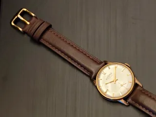 Elegante reloj de pulsera suizo de la década de 1950. - Caja de 32 mm - Esfera blanca con detalles en oro - Correa de piel marrón. - Movimiento mecánico cuerda manual - Chapado en oro de 24 KT - Agujas en oro 24 KT - Índices elevados en oro 24 KT - Correa nueva de cuero marrón con cordón - Funciona perfectamente, servicio y mantenimiento realizado en noviembre de 2025