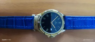 Exclusivo reloj para mujer de la firma de lujo LOEWE. Una pieza de colección que combina la precisión de la relojería suiza con el diseño inconfundible de la casa española. Características principales: Maquinaria: Movimiento de cuarzo suizo (Swiss Made) con fecha. Caja: Acero inoxidable con baño de oro en excelente estado. Dial: Negro elegante con números romanos y calendario a las 6. Correa: Piel auténtica azul con grabado tipo coco, fabricada en España.