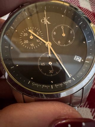 Elegante reloj Calvin Klein con esfera negra y detalles plateados. Un accesorio sofisticado para cualquier ocasión. - Diseño moderno. - Correa de metal. - Resistente al agua (verificar especificaciones). - Fabricado en Suiza.
