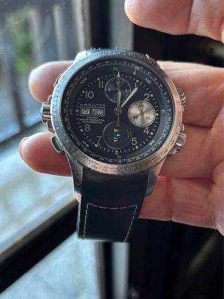 Reloj Hamilton Khaki Navy Regatta automático con correa de cuero azul. • Marca: Hamilton (Swiss Made) • Modelo: Khaki Navy Regatta • Movimiento: Automático suizo (ETA/ Valjoux modificado por Hamilton) • Funciones: • Hora, minutos y segundero central • Cronógrafo • Contador de regata (banderas náuticas a las 6) • Día y fecha (ventana a las 9) • Caja: Acero inoxidable • Diámetro: ~42-43 mm • Cristal: Zafiro • Bisel: Regla de navegación / brújula • Resistencia al agua: 100 m • Estilo: Náutico / deportivo • Esfera azul