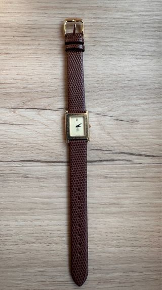 Elegante reloj con correa de cuero. - Correa de cuero marrón. - Detalles dorados en la caja y hebilla. - Fondo de acero inoxidable. Se encuentra parado posiblemente por falta de batería
