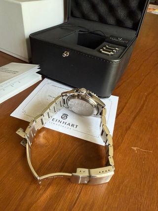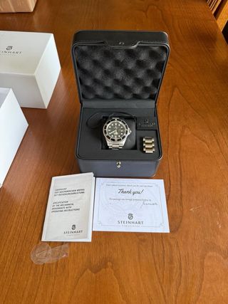 Precioso reloj Steinhart Ocean One en excelentes condiciones. Incluye caja y documentación original. reloj suizo 42mm sin contar corona cristal de zafiro,corona roscada sumergible a 300m con certificado ISO, se regala pulsera de piel nueva • Movimiento automático • Correa de acero inoxidable. • Esfera negra -completo con su caja y documentación y los eslabones extra -impecable estado muy muy poco uso