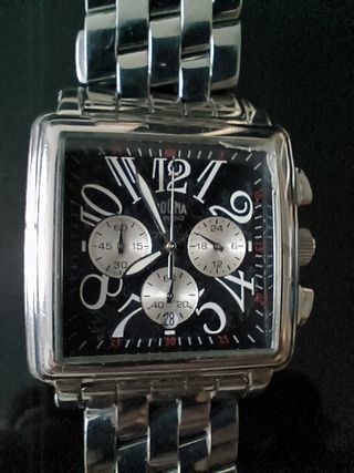 Vendo reloj Jaguar original, cronógrafo, Swiss Made, en acero inoxidable, elegante y deportivo a la vez. Características: • Marca: Jaguar • Movimiento: cuarzo suizo • Cronógrafo funcional • Resistencia al agua: 100 metros • Caja cuadrada de acero inoxidable • Esfera negra con detalles en tono rosé • Fecha a las 4 • Referencia: J633 Estado: • El reloj funciona correctamente • Cristal y caja con marcas normales de uso (ver fotos) • ⚠️ Importante: la correa de piel está cosida/fijada, no es intercambiable sin pasar por relojero. La correa está usada, se recomienda cambiarla si se quiere dejar perfecto. Ideal como reloj