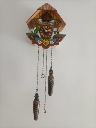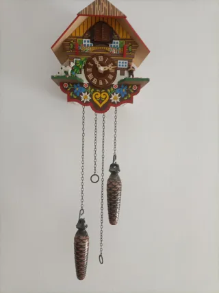 Bonito reloj de cuco con un diseño tradicional y detallado. - Figuras decorativas. - Cadena con piñas. - Esfera con números romanos.