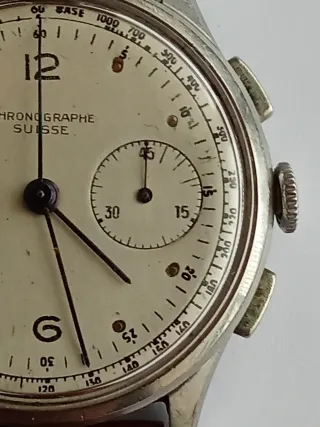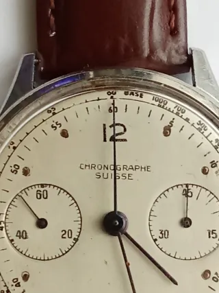 Reloj cronógrafo, caja de acero, hecho en Suiza, diámetro caja 34 mm, 36 mm con la corona. máquina calibre Venus 175, esfera original, funciona perfectamente, plexiglás en buen estado, correa marrón nueva