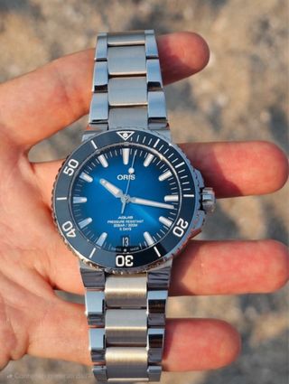 Elegante reloj Oris Aquis con esfera azul y brazalete plateado. - Resistencia al agua de 30 BAR / 300M. - Indicador de reserva de marcha de 5 días. - Fabricado en Suiza.