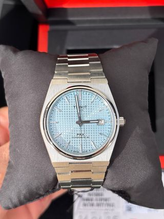 Reloj Tissot PRX con esfera azul y brazalete plateado. - Movimiento Powermatic 80. - Diseño deportivo y elegante. - Fabricado en Suiza.