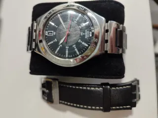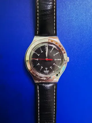 Reloj de pulsera Swatch Irony, caracterizado por su caja de metal y esfera negra. - Esfera negra. - Correa de cuero. - Diseño clásico.