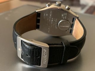 Reloj Swatch Irony Chrono con correa de cuero en perfecto estado. El crono funciona perfectamente pero no se por que las agujas del reloj no se mueven , se guardo y al ir a ponérmelo ya no funcionaba. Esta perfecto estéticamente (como nuevo) Modelo inusual, no rebajó el precio . - Esfera negra. - Bisel plateado. - Correa de cuero negra