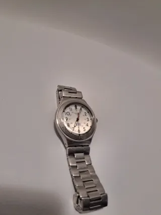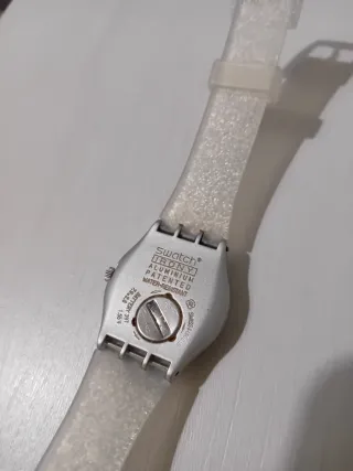 En venta reloj Swatch original de la colección Irony, fabricado íntegramente en aluminio. Es un modelo muy ligero, resistente y con un diseño minimalista que nunca pasa de moda. Marca: Swatch (Swiss Made). Colección: Irony Aluminium. Diseño: Esfera blanca limpia con ventana de fecha (calendario) a las 12. Medida de caja: 31.6 mm (ideal para mujer o muñecas finas). Correa: Brazalete de aluminio original con cierre de seguridad grabado. Estado: Buen estado estético, con marcas normales de uso que no afectan a su funcionamiento. Resistente al agua. Se entrega funcionando y con pila.