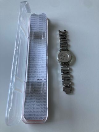 Precioso reloj Swatch IRONY para mujer. Elegante y en buenas condiciones. - Modelo IRONY de Swatch. - Correa de acero inoxidable. - Resistente al agua - Tamaño se puede ajustar retirando eslabones de la correa Necesita cambio de bateria