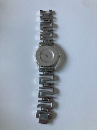 Reloj Swatch de mujer. Para muñeca estrecha (le quité los eslavones que me sobraban y ya no los tengo). Está un poco rallado (se aprecia en la última foto). Se vende con la caja original. Se tiene que cambiar la pila.