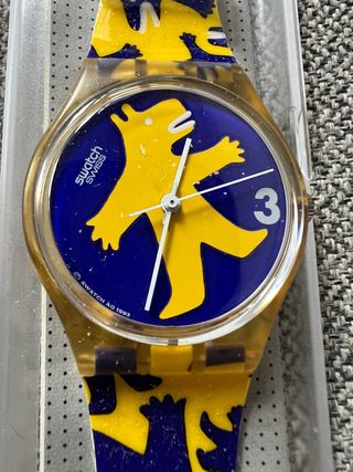Reloj Swatch con un diseño divertido y colorido. Reloj vintage a estrenar, sin pila para preservar el mecanismo. - Esfera azul con un oso amarillo. - Correa con estampado de osos amarillos sobre fondo azul. - Año de fabricación: 1993