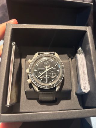 Reloj Omega x Swatch de edición limitada. - Diseño inspirado en la luna llena. - Correa de cuero negra y detalles plateados. Se regala correa de cuero Es el reloj de los farolillos suizos