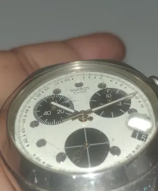 Reloj Swatch con diseño de cronógrafo. - Esfera blanca con detalles plateados. - Bisel con escala taquimétrica. - Subesferas para funciones de cronógrafo. -Sin Pila!! -Marcas cristal
