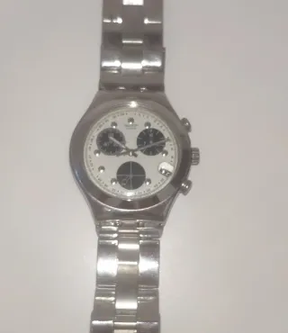 Original Swatch Irony Chrono, Swiss Made. Vintage Swatch Irony Chronograph Stainless steel case Original dial and pushers Swiss Made Comes with: Original Swatch Irony Chrono box Original warranty / booklet Condition: Watch in very good vintage condition Dial clean and well preserved Pushers and crown in place Box shows normal signs of age No major scratches or damage A great piece for Swatch collectors, vintage watch lovers or 90s design fans.