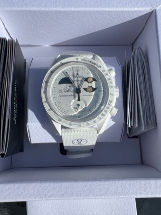 Vendo Omega x Swatch MoonSwatch en color blanco, en perfecto estado. Reloj muy poco uso, siempre guardado en su caja original. Incluye: • Caja • Manuales • Correa original blanca con logo Omega Modelo con cronógrafo y escala taquímetro, diseño inspirado en el mítico Speedmaster. Muy ligero y cómodo para el día a día. Se entrega tal cual en las fotos.
