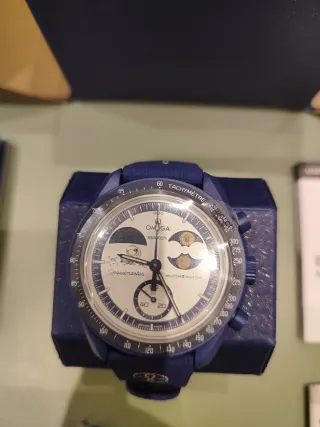 Reloj Omega x Swatch Unidad vendida el 8 de septiembre, se ha comprado en la tienda de Valencia. Solo venta en mano. 361 Full set, bolsa+caja+documentación+ticket compra - Esfera blanca con detalles de la luna y Snoopy. - Correa de tela azul con el logo MOONSWATCH. - Caja de material Bioceramic en color azul. - Indicación fase lunar - detalles especiales visibles con luz ultravioleta