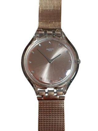 Reloj de pulsera Swatch de niña con un diseño elegante y moderno: - Correa de eslabones plateados. - Esfera en tono rosa pálido. - Posibles signos de uso (fijarse en las fotos). - DESCONOZCO SI FUNCIONA O NO.