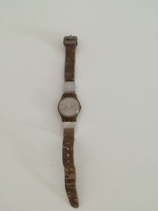 Elegante reloj Swatch con correa de cuero y detalles metálicos. - Esfera redonda. - Diseño clásico y versátil. Necesita recambio de la correa y pila.
