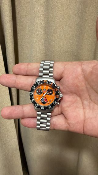 Reloj TAG Heuer con esfera naranja y detalles plateados. Un accesorio deportivo y elegante. - Bisel con marcadores. - Correa de metal plateado.