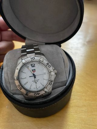 Reloj TAG Heuer Aquaracer WAF1111 en perfecto estado. Vintage. Fabricado 2005. Incluye caja original y certificado - Caja y brazalete de acero inoxidable. - Esfera blanca con marcadores de hora plateados. - Bisel giratorio unidireccional.