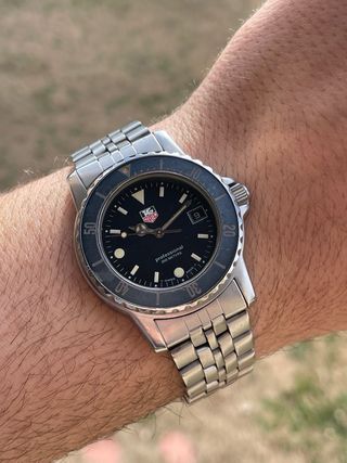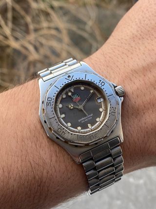 Reloj Tag Heuer 3000 Professional 36 mm, un auténtico icono de la relojería deportiva suiza de los años 90, con diseño robusto y estética atemporal. • Caja de 36 mm en acero inoxidable. • Bisel giratorio unidireccional. • Esfera negra con índices luminiscentes. • Agujas luminosas. • Ventana de fecha a las 3 h. • Movimiento suizo de cuarzo Tag Heuer, preciso y fiable. • Brazalete original de acero Tag Heuer, sólido y cómodo. Reloj 100% original, en buen estado general, con marcas de uso visibles acordes a su edad. Viene sin caja y papeles.