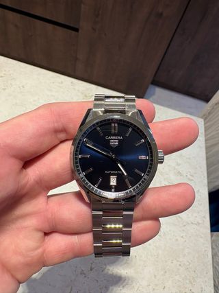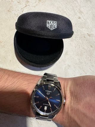 Reloj TAG Heuer Carrera Calibre 5. - Esfera de color azul. - Brazalete de acero inoxidable. Solo reloj y caja . Cristal algo rayado . Funciona perfectamente 0 segundos de fallo . Entrega en mano en madrid