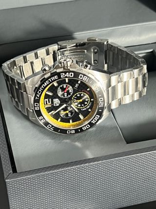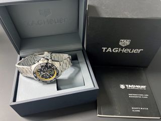 TAG Heuer modelo CAZ101AC.BA0842, 43 mm, cuarzo, 200 m de resistencia al agua. El reloj está impecable, casi sin uso y funciona de maravilla. Si te interesa, háblame. - Caja de acero inoxidable. - Bisel con taquímetro. - Esfera negra con detalles amarillos. - Correa de acero a juego.