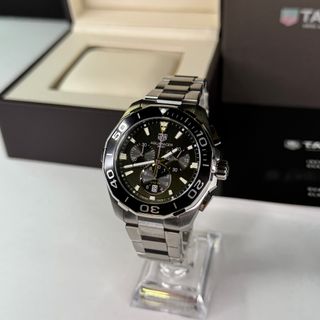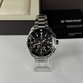 TAG Heuer Aquaracer Chronograph – CAY111A.BA0927 • Movimiento crnógrafo suizo de alta precisión • Caja de acero inoxidable de 43 mm con bisel giratorio unidireccional • Esfera negra con 3 subesferas de cronógrafo: 1/10 s, segundos y 30 min + fecha • Cristal de zafiro resistente a arañazos • Resistencia al agua de 300 m (30 bar) • Brazalete de acero con cierre desplegable y extensión para buceo ✅ Estado: Muy bueno - sin marcas de uso 📦 Incluye caja original y documentación