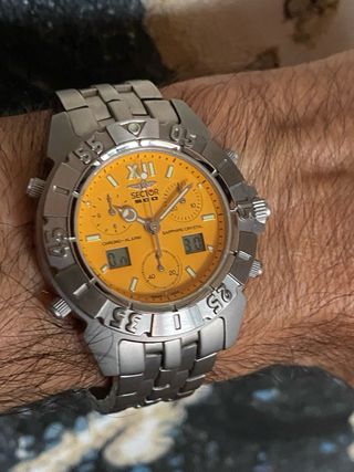 Reloj Sector 500 con cronógrafo y alarma NOS. Esfera de color amarillo. Acabado del acero en mate. - Brazalete acero - Caja acero 39 mm - Cristal de zafiro. Omega.longines.certina.cyma.angelus.tissot.hamilton.doxa.tressa.yema.oris.rolex.tudor.enicar.zodiac.bulova.cauny.dogma.zenith.universal Geneve.seiko.tag Heuer.citizen.fortis.duward.aquastar.