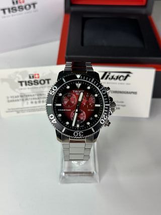 Tissot Seastar 1000 Chronograph – T120.417.11.421.00 Un cronógrafo suizo robusto y marcado para el buceo, con diseño atrevido y funcionalidad de alto rendimiento: • Movimiento suizo de alta precisión • Caja de acero 316L de 45.5 mm con bisel unidireccional • Esfera roja degradado con subesferas de cronógrafo e índices luminiscentes Super-LumiNova • Cristal de zafiro resistente a arañazos • Resistencia al agua 300 m (30 bar) • Brazalete de acero con cierre desplegable y extensión para buceo ✅ Estado: impecable 📦 Incluye caja original y papeles