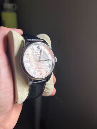 Reloj Tissot Le Locle con movimiento Powermatic 80. - Esfera blanca con detalles texturizados. - Indicadores horarios en números romanos. - Correa de piel negra. - Caja de acero inoxidable.