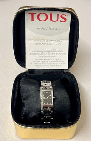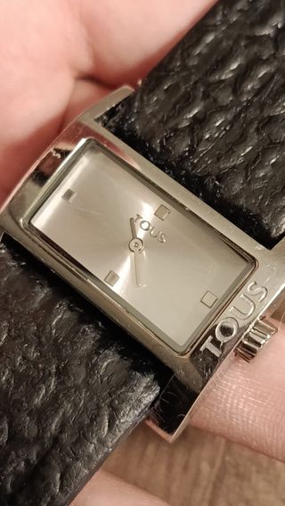 Elegante reloj Tous con esfera plateada y correa de cuero negra. Un accesorio sofisticado para el día a día. - Diseño rectangular. - Detalle del logo Tous en la esfera y el lateral. Funciona perfectamente, aunque hay que cambiarle la pila.
