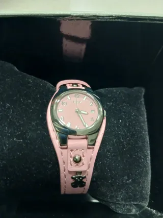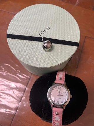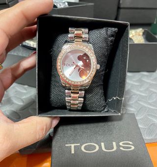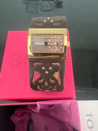 Reloj de la marca Tous con un diseño moderno y elegante. - Correa de silicona en color rosa. - Caja y detalles metálicos en tono dorado. - Esfera con el icónico osito de Tous. ME COSTÓ 189 euros,muy bien cuidado. NO TIENE PILAS.