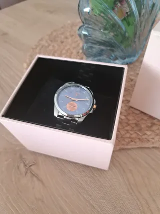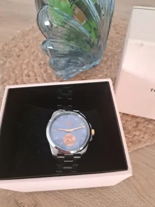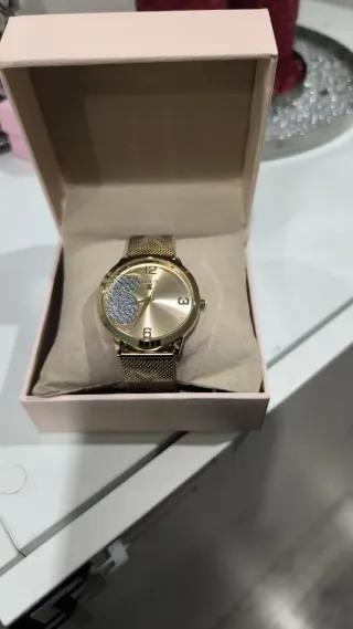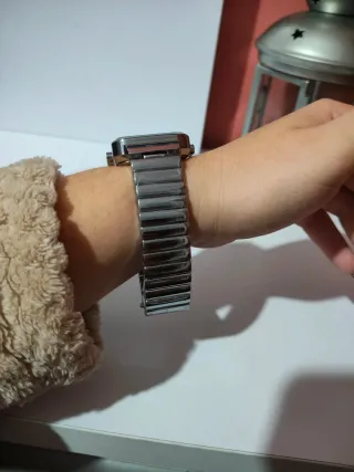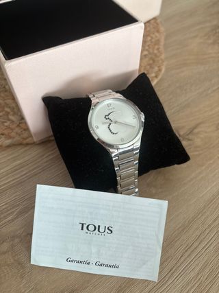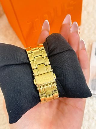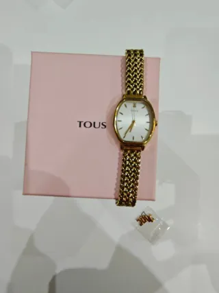 Reloj inteligente de la marca TOUS, brazalete de acero inoxidable en color dorado. Es un accesorio súper elegante que combina la estética de un reloj clásico con las funciones tecnológicas actuales. ✨ Detalles destacados: Pantalla táctil, diseño ideal tanto para diario como para ocasiones especiales. Incluye eslabones adicionales (ver fotos) para ajustar el tamaño de la pulsera a tu muñeca. • Funciones: Notificaciones de llamadas/mensajes, contador de pasos, monitor de sueño, control de música, entre otros (se vincula con la App TOUS Wear). El reloj está muy bien cuidado, sin rayones evidentes en el cristal como nuevo. Funciona perf