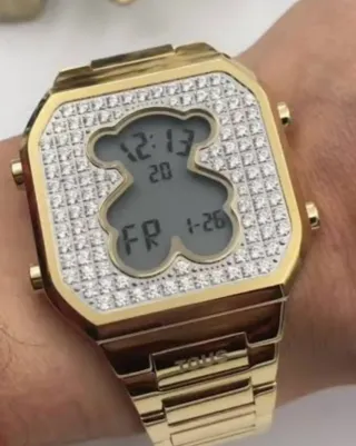 Elegante reloj con un diseño llamativo. - Bisel adornado con pequeñas piedras brillantes. - Correa de eslabones metálicos. - Esfera con diseño de osito.