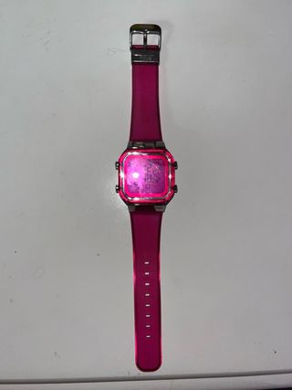 Reloj digital Tous con correa de silicona rosa y detalles plateados. - Diseño moderno y llamativo. - Correa ajustable. - Esfera cuadrada.