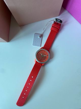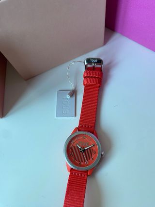 Reloj de la marca Tous con un llamativo diseño. Esta sin estrenar, con todas las etiquetas y la caja, - Correa de tela roja. - Esfera con detalles rayados.