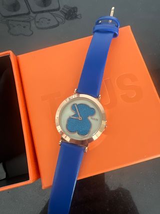 Precioso reloj Tous original con un diseño elegante. - Esfera de color azul claro. - Detalle de osito en la pulsera. - Brazalete de eslabones azules de silicona. - Se envía sin caja original. - Se le cambió la correa como se ve en la foto, pero se conserva la original intacta. Disponible entrega en mano en Valencia o envío.