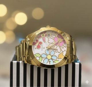 Reloj TOUS dorado, súper bonito y en perfecto estado. Diseño muy alegre con flores de colores y el osito típico de la marca. Funciona genial, lleva fechador y es de acero inoxidable. Lo entrego con su caja y bolsa original de TOUS, los eslabones sobrantes y una esfera original en color dorado por si quieres cambiar el estilo. Lo vendo porque no lo uso y está prácticamente nuevo, tal como se ve en las fotos. Ideal para regalo o para quien quiera un reloj llamativo y de calidad. Entrega en mano