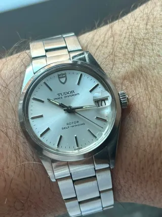 Tudor Oyster Prince Date + Day – 100% original Reloj suizo automático, 36mm Ref.: 94614 Año 1983 Esfera plateada original con pátina y ventanas de fecha y día. Agujas e índices en buen estado. Bisel liso de acero inoxidable y corona original firmada, totalmente funcional. Cristal acrílico original con lupa (cíclope) sobre la fecha. Caja de acero inoxidable con fondo firmado. Correa en buen estado de estilo vintage. Funciona correctamente, buena reserva de marcha y sin desviaciones de tiempo significativas. Envío rápido y seguro.