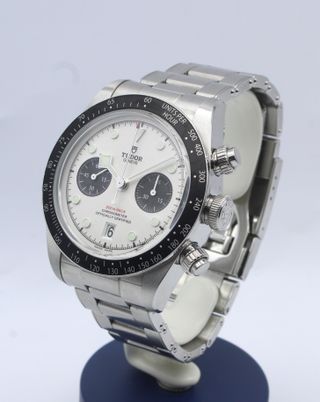 TUDOR BLACK BAY CHRONO. Ref.: 79360N Movimiento: Automático Caja: Acero Esfera: Blanca Diámetro: 45mm (con corona) 41,5mm (sin corona) Cristal: Zafiro Corona: Original Brazalete: Acero Año: 2024 FULL SET (Caja, documentación y eslabones adicionales) Revisado y funcionando correctamente.